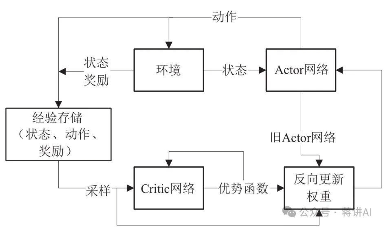 - 批评家模型:动态的“评论家”,预测未来累积奖励。输入指令(状态),预测当前策略下未来能获得的总奖励期望值。用于计算优势函数(Advantage),衡量当前动作比平均表现好多少。与策略模型同步更新,通过最小化预测值与实际回报的均方误差(MSE)优化。减少奖励信号的方差,提升训练稳定性。