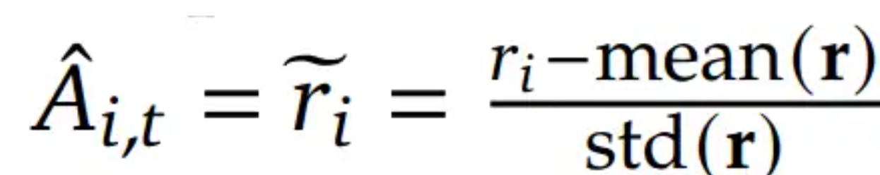 GRPO摒弃了价值函数模型的训练,二是通过组内奖励分数来评估基准线(advantage),大幅降低了训练资源的需求。GRPO首先根据问题q,生成一组回答(o1,...,oG),然后问题+回答输入Reference模型,并与Policy模型计算KL散度,约束Policy模型的更新幅度。此外,问题+回答输入Reward模型中输出一组奖励分数(r1,...,rG),与PPO显著不同的是,GRPO使用这一组奖励分数来估算A,具体公式为: