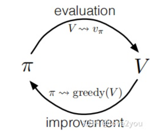 策略迭代算法是广义策略迭代(generalized policy iteration,GPI)框架下的一种算法,广义策略迭代是指使用策略评估策略改进相互作用的一种算法框架,几乎所有的强化学习算法都可以看成是GPI(包括策略迭代算法和值迭代算法)。