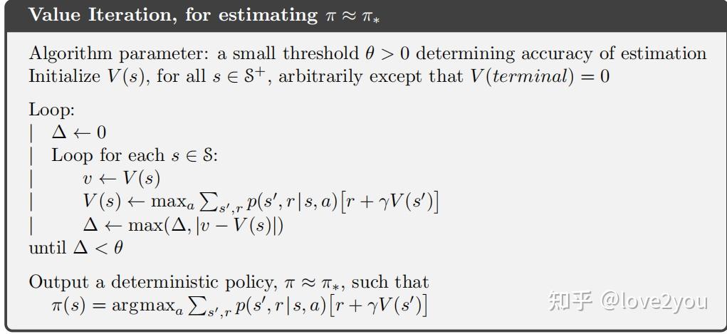 即可恢复最优策略(注意在价值迭代算法中并不存在显式的策略,但我们可以从最优状态价值函数中恢复最优策略,其收敛性如下),价值迭代算法伪代码如下: